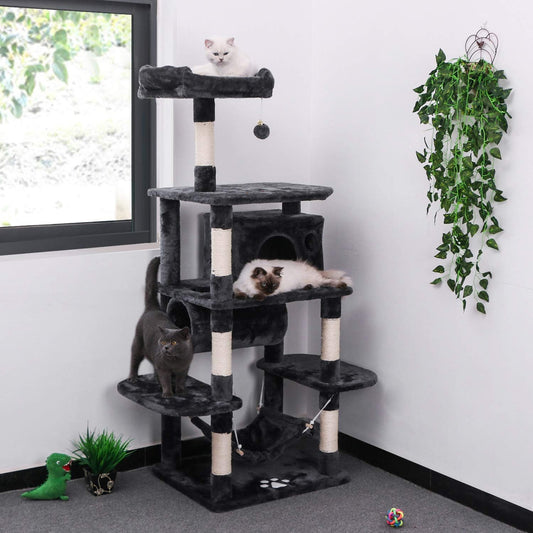 Deluxe Cat Tree Condo with Hammock, Tunnel, and Scratching Posts - Perfect Playground for Your Feline Friends in Smoky Grey